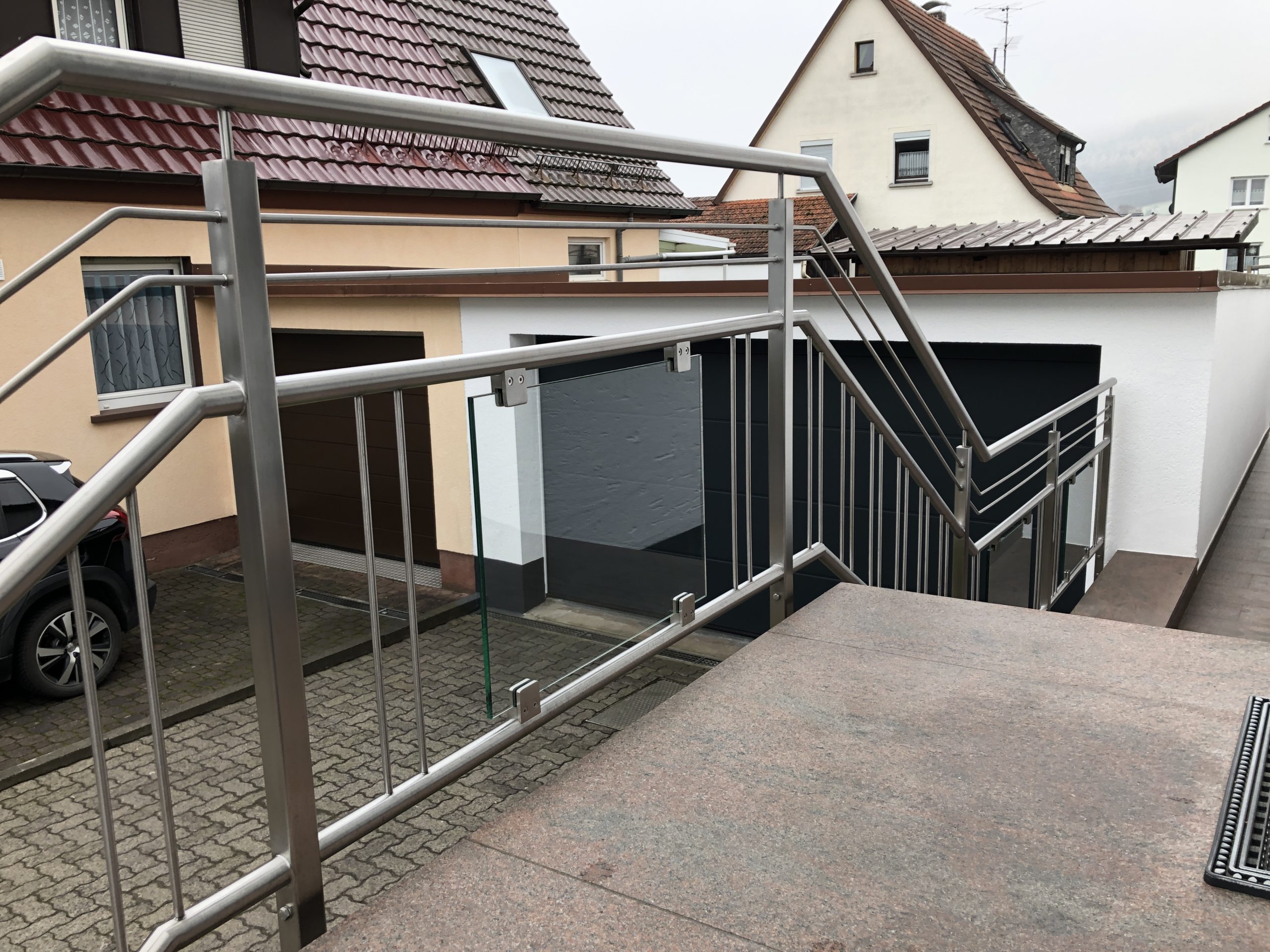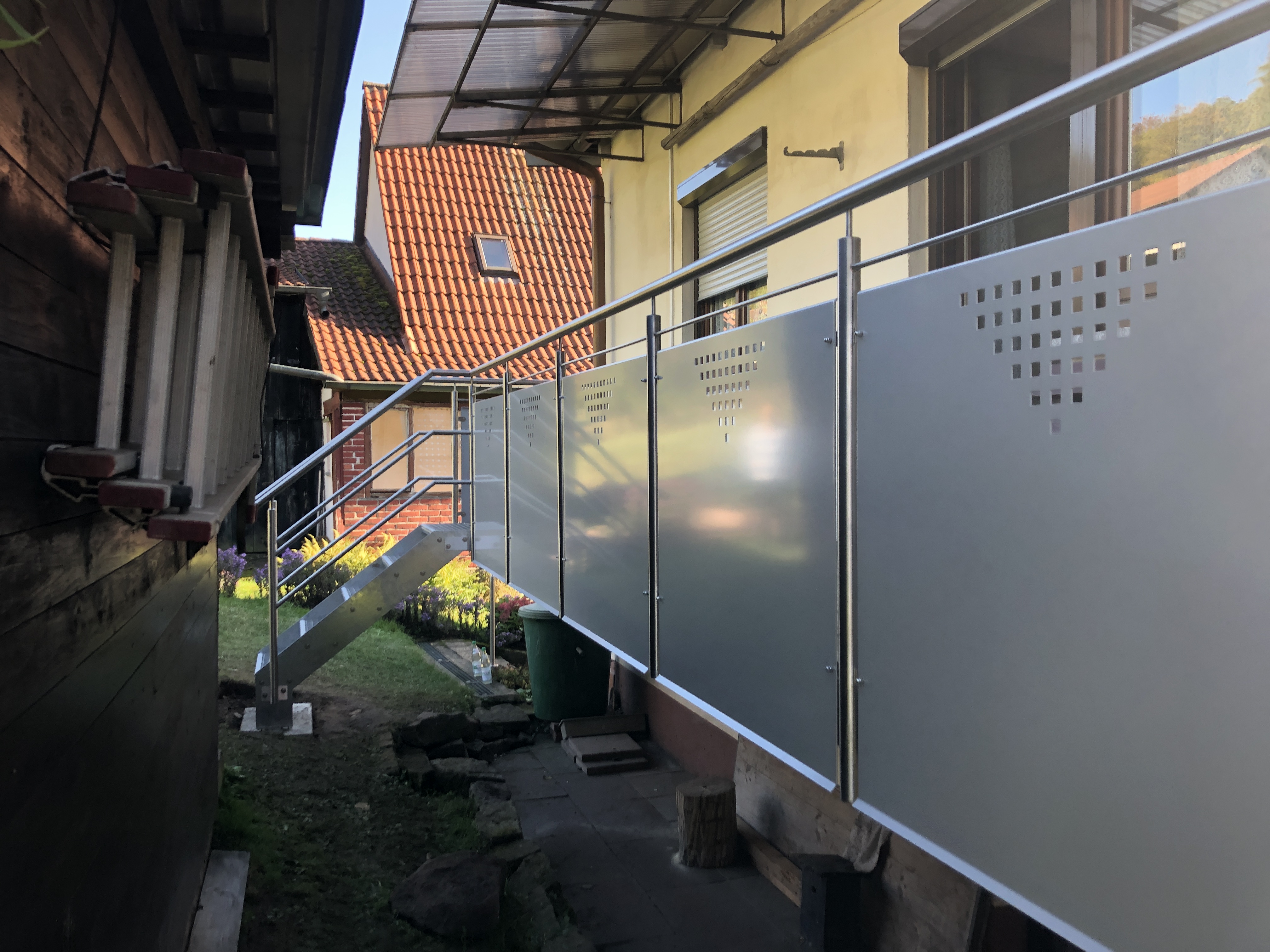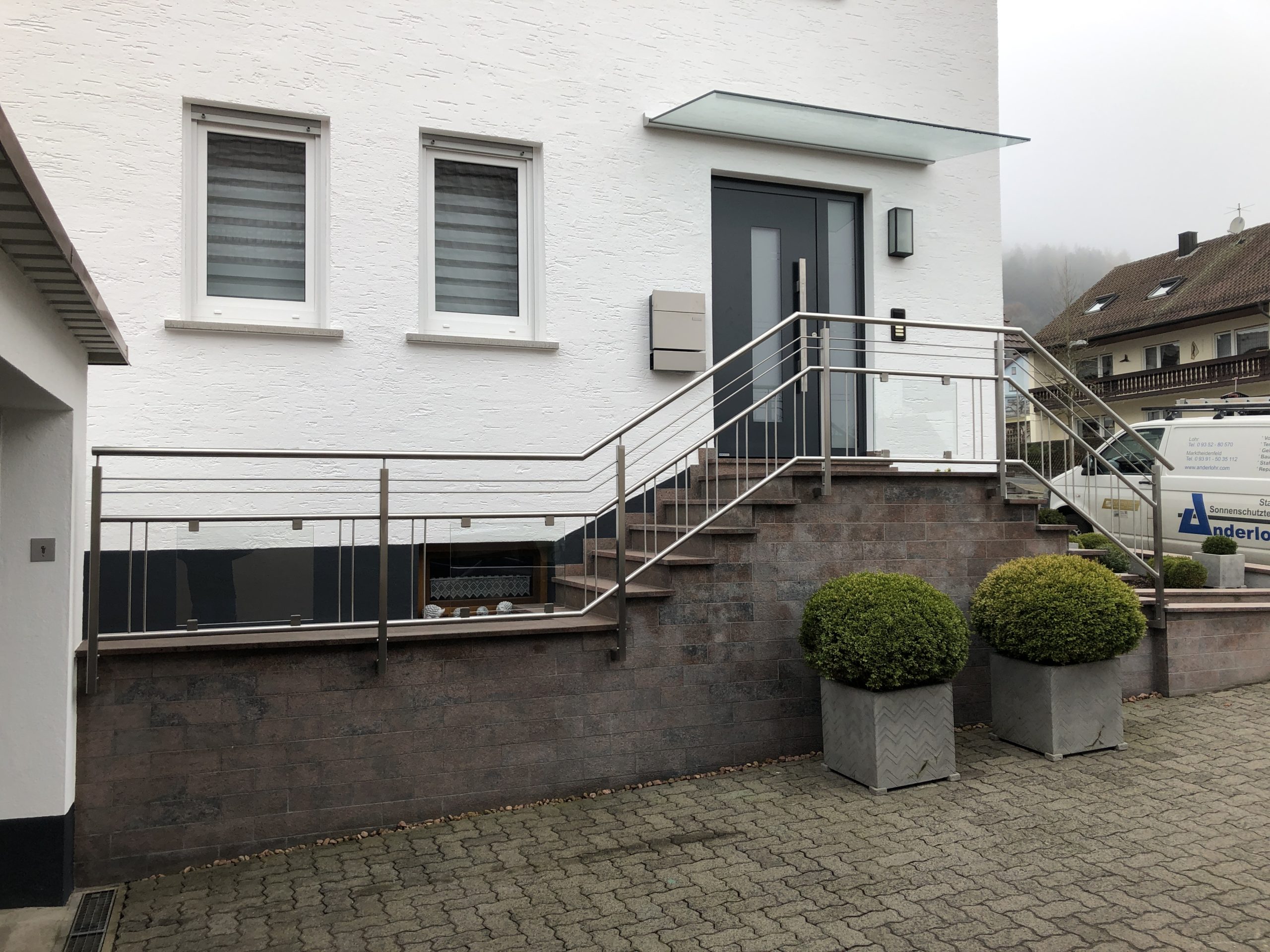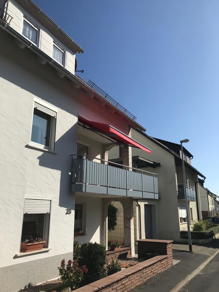 Das von uns angefertigte Terrassendach aus pulverbeschichtetem Stahl lädt auch bei schlechtem Wetter zum Aufenthalt im Freien ein. Bei gutem Wetter spenden die Unterglasmarkisen der Firma Warema kostbaren Schatten. Schutz vor der tief stehenden Abendsonne wird durch die an der Pfette befestigten Zip Markisen gewährleistet. Die Sonnenschutz Produkte können durch das WMS System von Warema über eine Fernbedienung, oder bequem per App am Handy gesteuert werden. Zusätzlich bekam der Kunde noch individuell angefertigte Gartenmöbel.